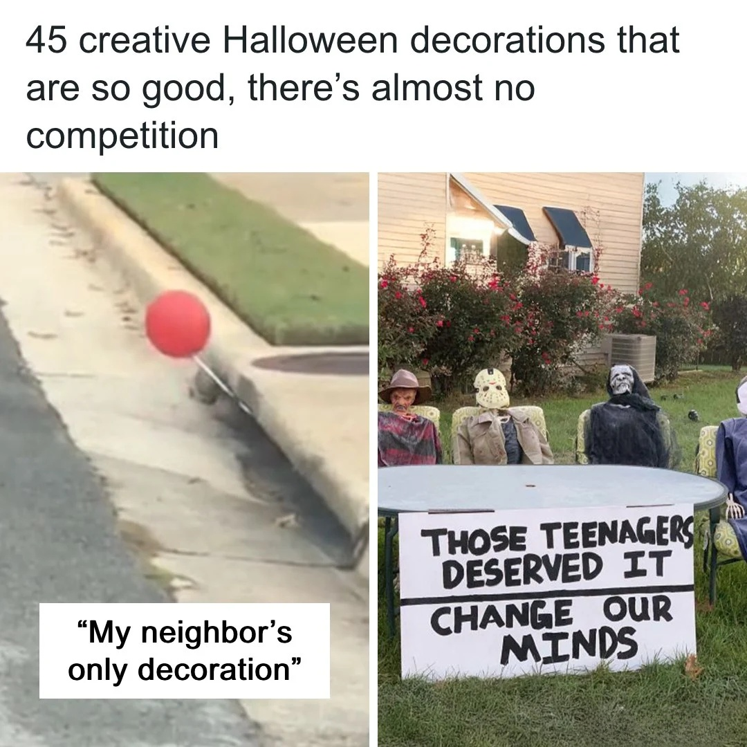 Decorations that stop us in our tracks often mix humor and horror, forcing us to do a double take. Whether it’s a fake guillotine in someone’s yard or the illusion of a “body” pinned under a garage door, we can’t help being drawn to the unexpected. These displays feed our fascination with the macabre while showcasing human imagination at its best.