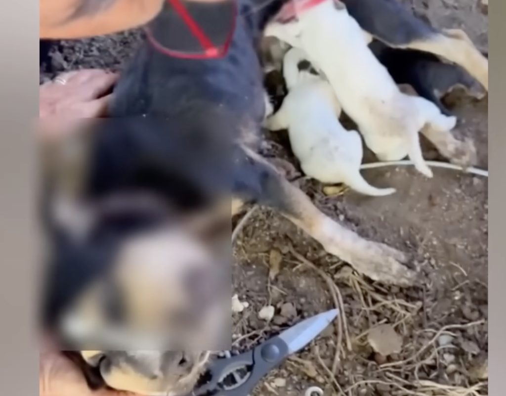 It all began with a quiet message—one that carried a weight no heart could ignore. It wasn’t dramatic or loud, but it was the kind of plea that stops your breath for a moment. Someone had discovered a mother dog tied to a tree in a remote, forgotten corner of the world. Beside her, her tiny puppies pressed themselves against her trembling body, trying to cling to whatever warmth she had left. Her frame was painfully thin, her eyes dim with exhaustion, and a rough metal chain cut deep into her neck, leaving marks that told a story of long, silent suffering. She had been left there even before her puppies were born, enduring hunger, thirst, and loneliness with a quiet resilience that no living creature should ever have to show.