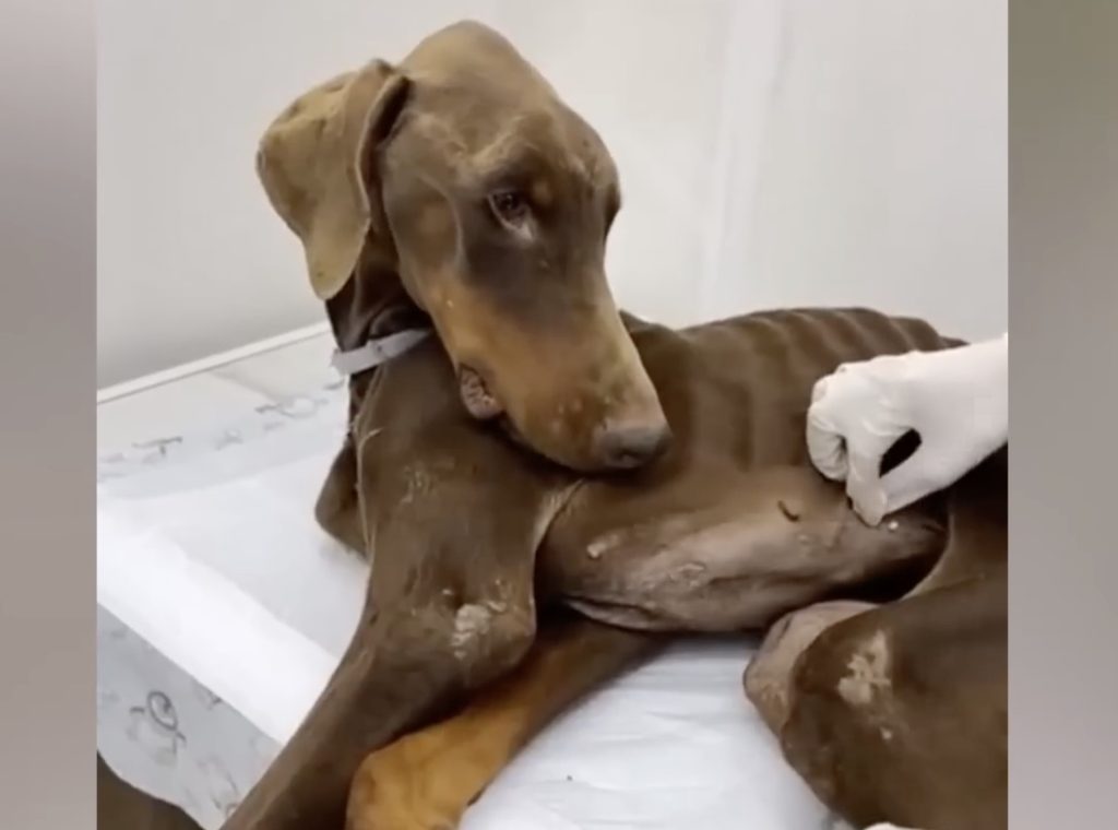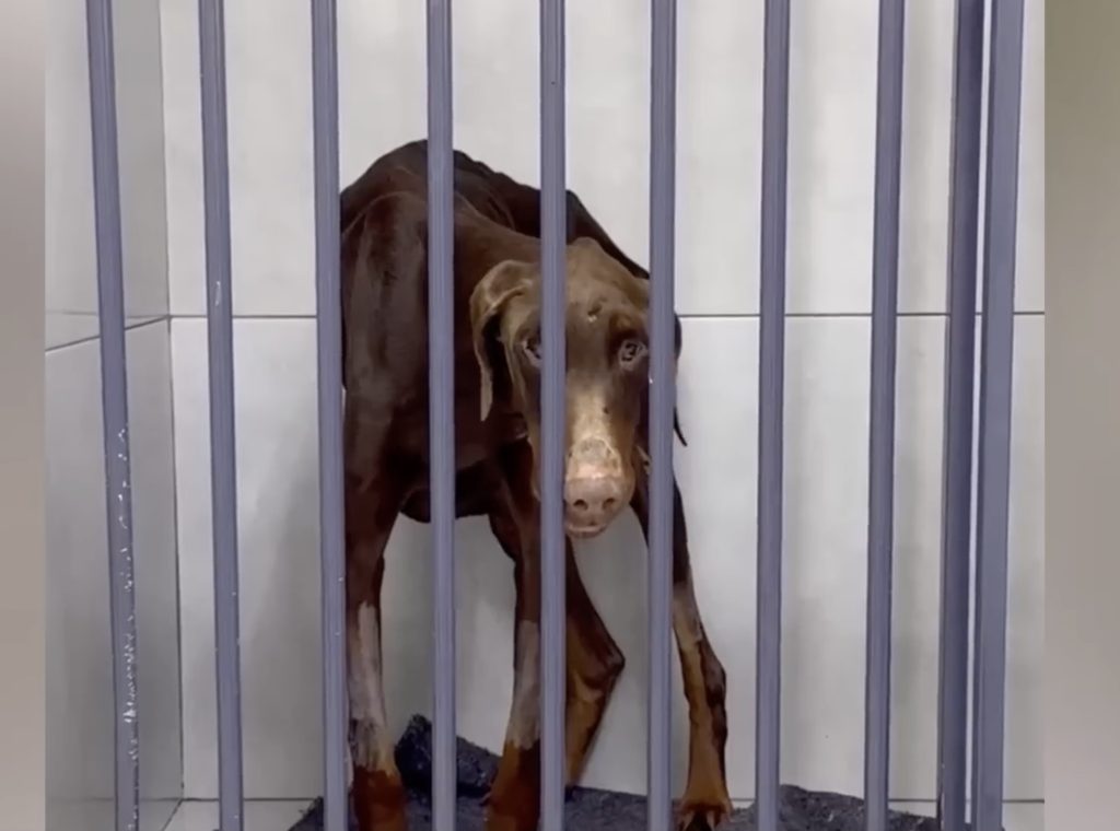 When rescuers first laid eyes on Bono, the Doberman, they felt something inside them sink. What stood before them wasn’t the strong, dignified figure people usually imagine when they think of this breed. Instead, they found a fragile, trembling soul who looked as though life had nearly slipped away. His body was little more than loose skin draped over sharp bones, and he didn’t have the strength to lift himself from the cold, filthy ground beneath him. His eyes revealed a story no words could truly capture—a mixture of exhaustion, confusion, and quiet suffering that no animal should ever have to bear. Bono had been discovered at an abandoned dog breeding facility, left behind by the owner, a pet shop operator who had simply walked away without a backward glance.