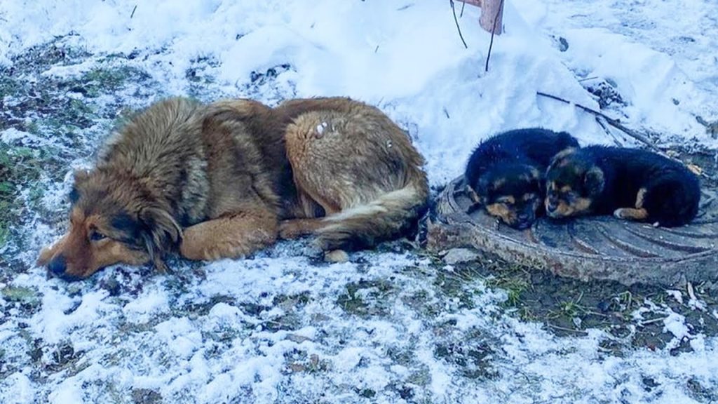 On a bitter winter morning, when the cold seemed to settle deep into every corner of the world, a compassionate passerby stumbled upon a sight that stopped them in their tracks. There, curled tightly in the snow, was a stray mother dog wrapped around her two tiny puppies, doing everything in her power to shield them from the freezing air. The wind cut through the quiet like a blade, and the ground was so cold it seemed to steal warmth straight from the bone. Yet this fragile little family had no shelter, no protection, and no one who even knew they were there. The mother’s fur was stiff with frost, her body trembling as she fought against the cold. People had walked past before, glancing briefly before moving on, unaware that life itself was slipping away right in front of them.