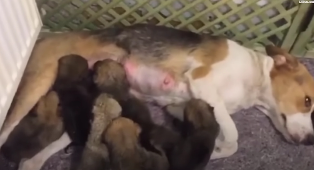 The mother was clearly exhausted. Her body seemed frail, her movements barely more than gentle shivers, yet her spirit had not dimmed. Weak as she was, she never took her eyes off her puppies. Even though she could hardly stand, she positioned herself like a shield, determined to keep them safe. Every bit of strength she had left was poured into protecting them. There was something profound in her gaze—a mixture of fear, determination, and a quiet acceptance of her own limits. It felt as though she understood she was reaching the end of her strength, yet what mattered to her most was that her babies would go on.
