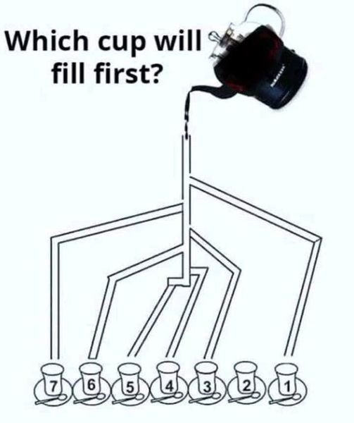 Take a good look at this brain teaser and see if you can figure out which cup will fill before the others. The image shows several cups connected by a series of pipes, but only one cup will fill up first based on the structure of the system. At first glance, it might seem simple, but the solution requires close attention to the paths and blockages.