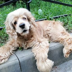 She was kicked out when she couldn’t have more puppies with poor eyes and deaf ears